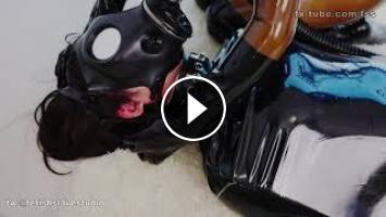 Three asian latex girls bondage sleepbag gasmask catsuit latexsuit play Feet fetish porn