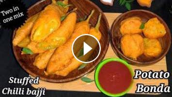 Chilli is stuffed with a tangy spice mix first. Then dipped in besan batter and fried. Later the fried chillies are again stuffed with a spiced potato and onion stuffing. The combination of crunchy spiced onions with the crispiness of the fried green chilli bajji is truly tongue tickling and yum.